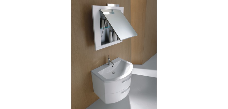 Weitere Produkte der abgebildeten Badmöbel-Kombination: Waschtisch-Unterschrank gerundet Breite 70 cm mit 2 Auszügen / Schubladen, Klapp-Spiegelschrank Wall Breite 60 cm x Höhe 60 cm, Leuchte Sirio.