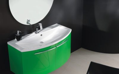 Gerundeter Mineralguss-Waschtisch in Weiß glänzend, Breite 105 cm. Waschtisch-Unterschrank gerundet Breite 105 cm mit 2 Türen, Badezimmerspiegel Sphera 90 cm. Badmöbel-Programm: OLA.